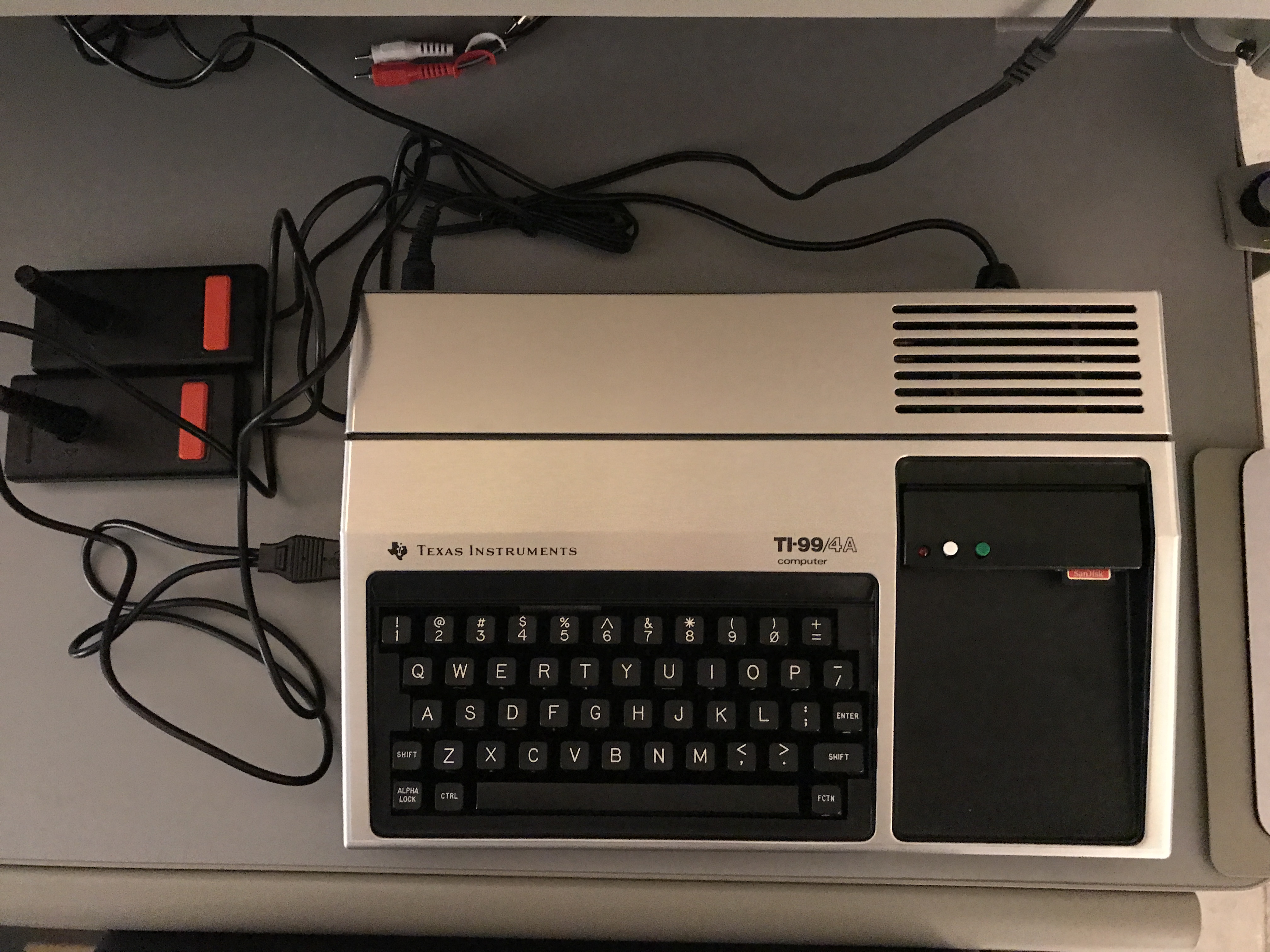 Texas Instruments 99/4A w/ original joysticks and the FinalGrom99 cart in use